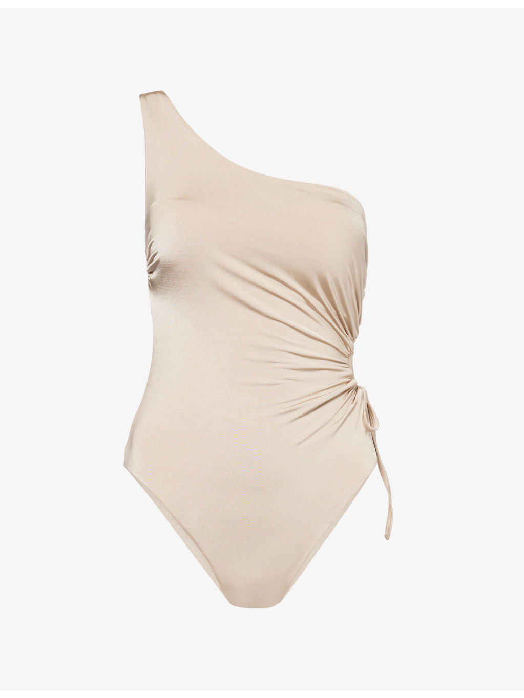 PRODUCT DETAILS - Max Mara swimsuit - 82% polyamide, 18% elastane - Asymmetric neckline, removable cups, cut-out and self-tie fastening at side, logo plaque at back, medium coverage - Hand wash - True to size - Model is 5ft 10in/1.78m and wears a size small - Lightweight, stretchy Ref: R04421988