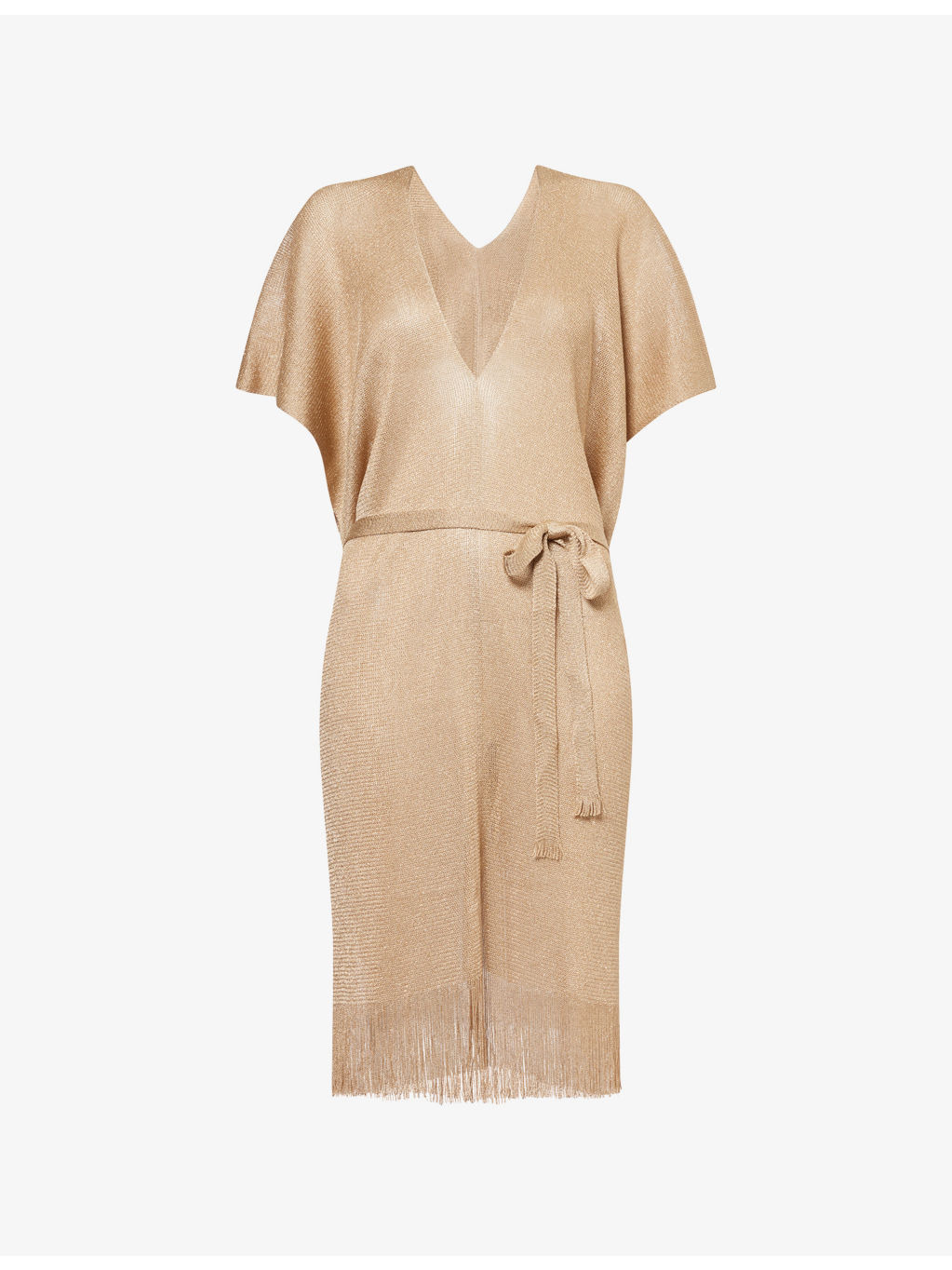 PRODUCT DETAILS - Max Mara knitted mini dress - 80% viscose, 10% metallic fibres, 10% polyamide - Relaxed fit, V-neck, short sleeves, split at sides, all-over metallic weave, all-over knitted, fringed trims - Dry clean - True to size - Model is 5ft 10in / 1.78m and wears one size - Lightweight, stretchy Ref: R04421977
