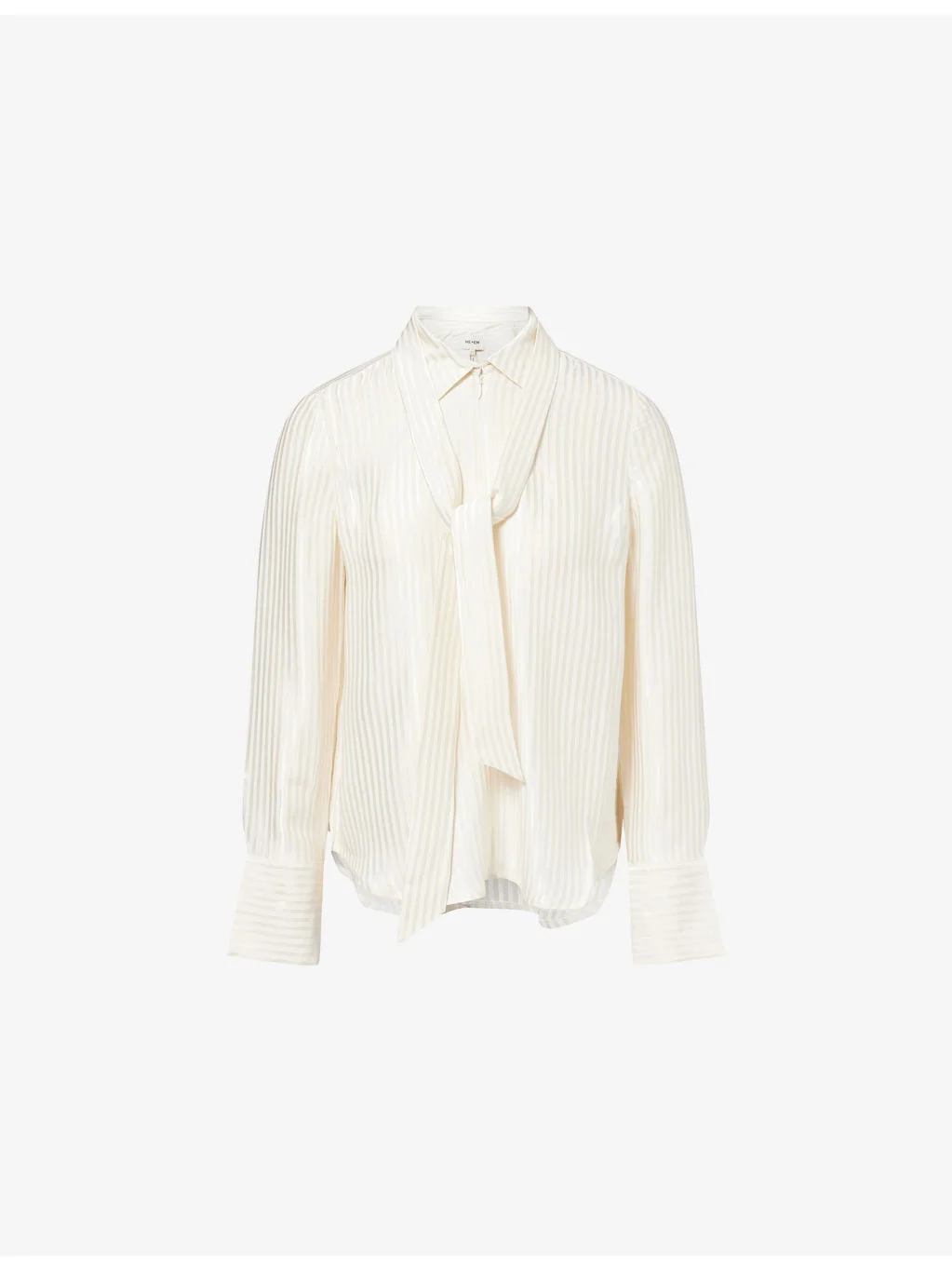 PRODUCT DETAILS - ME + EM satin shirt - 100% Viscose - Concealed zip fastening - Regular fit, pointed collar, removeable neck tie, long sleeves, buttoned cuffs, all-over pinstripe, curved hem - Dry clean - True to size - Model is 5ft 10in/1.78m and wears a size UK 8 - Lightweight, non-stretch Ref: R04557605