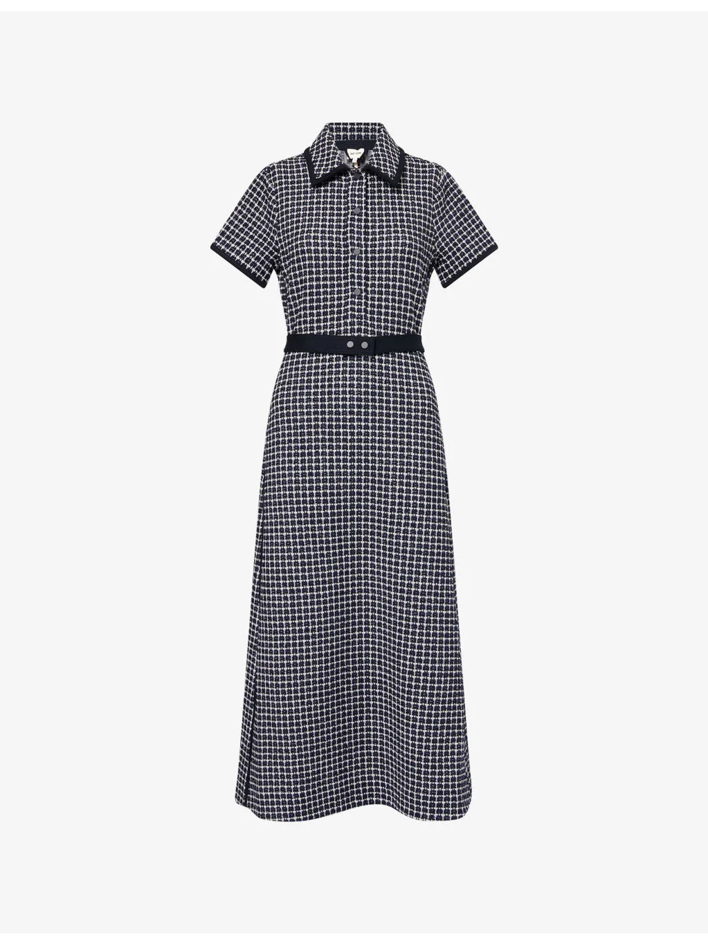 PRODUCT DETAILS - ME + EM wiven midi dress - 41% Cotton, 40% Polyester, 15% Acrylic, 4% Viscose - Button fastening - Fit and Flare shape, collar, short sleeves, removable smocked belt, - Dry clean - True to size - Length: 52in / 132cm - Model is 5ft 10in/1.78m and wears a size UK 8 Ref: R04600521