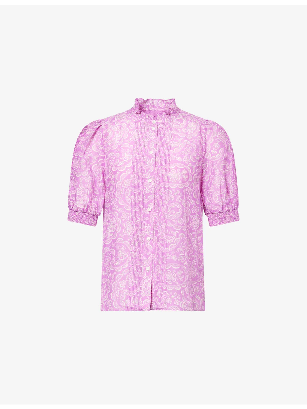 PRODUCT DETAILS - ME + EM cotton and silk-blend blouse - 70% cotton, 30% silk - Exposed button fastenings at front - Regular fit, stand collar, frill trim at neck, short puff sleeves, shirred cuffs, all-over floral lace print - Hand wash cold - True to size - Model is 5ft 10in/1.78m and wears a size UK 8 - Lightweight, non-stretch Ref: R04600579