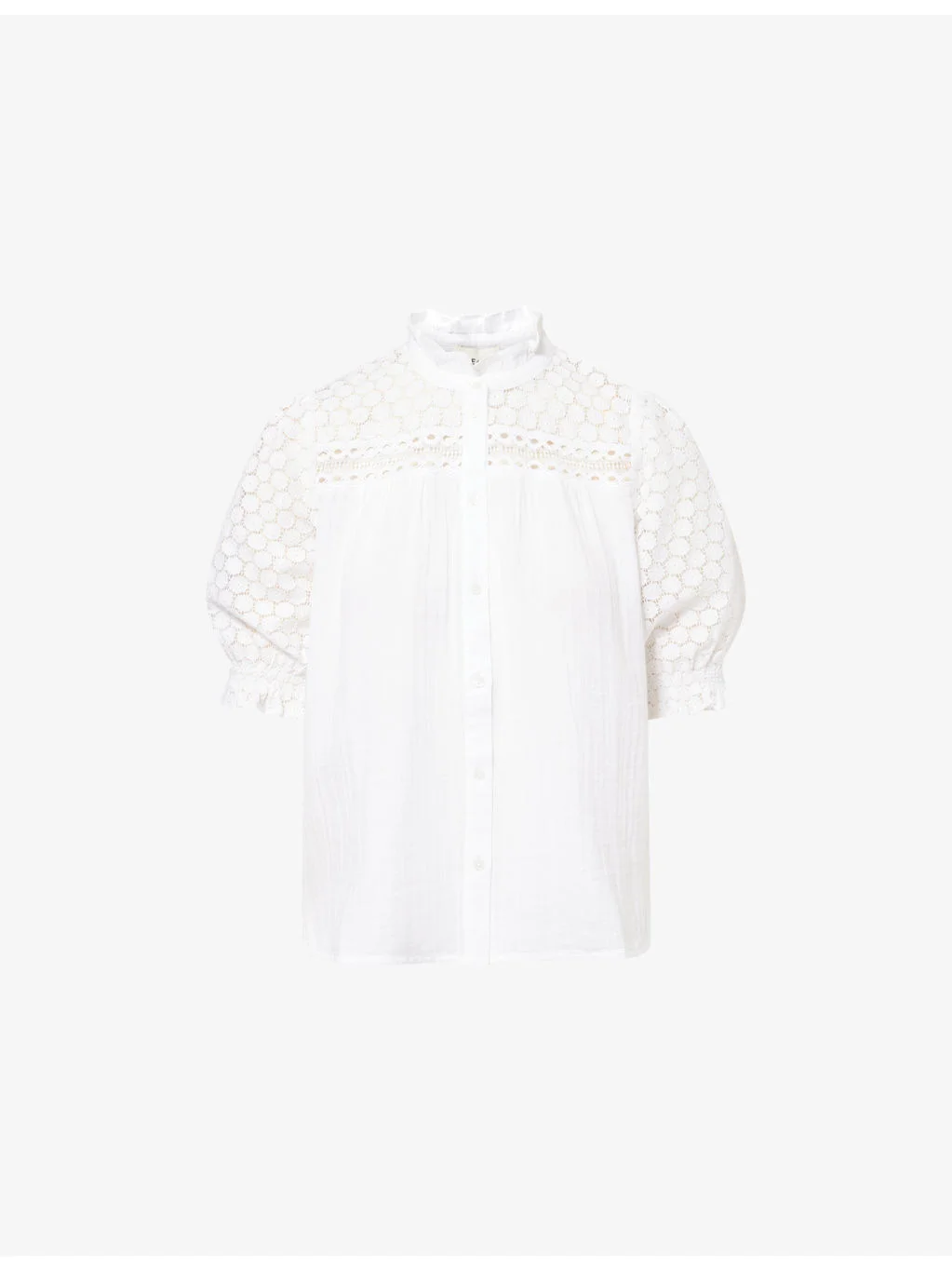 PRODUCT DETAILS - ME+EM cotton top - 100% Cotton - Button fastening at front - Regular fit, round neck, ruffle at neck, lace panel at shoulders and sleeves, short sleeves - Machine wash at 30°C - Made in India - True to size - Size UK 8: length 24in / 61cm - Model is 5ft 10in/1.78m and wears a size UK 8 - Lightweight, slight stretch Ref: R04611603