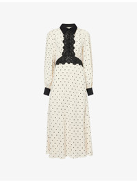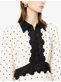 PRODUCT DETAILS - ME + EM woven midi dress - 100% viscose - Concealed zip fastening at side - Regular fit, contrast classic collar, long sleeves, elasticated cuffs, sheer lace contrast at front and waistband, elasticated waistband at back, all-over polkadot print, part lined - Dry clean - True to size - Size UK 8: length 51in / 129.5cm - Model is 5ft 10in/1.78m and wears a size UK 8 - Lightweight, non-stretch Ref: R04594053