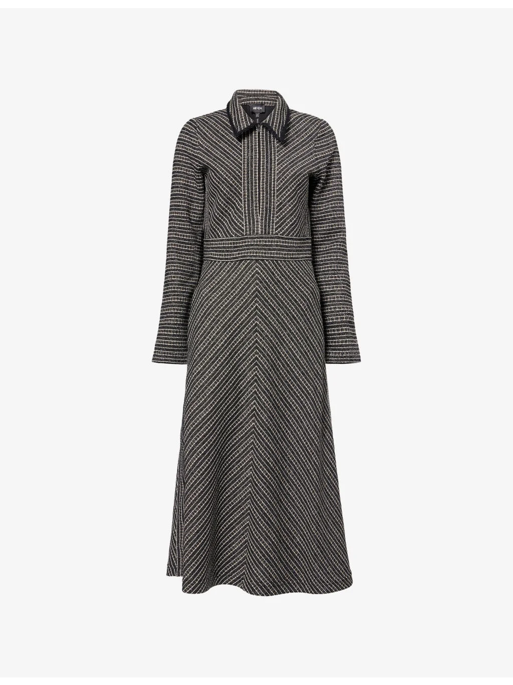 PRODUCT DETAILS - ME+EM knitted midi dress - 53% polyester, 23% viscose, 12% acrylic, 10% cotton, 2% metallised fibres; trim 51% cotton, 26% polyamide, 23% mohair - Concealed zip fastening at front - Regular fit, spread collar, long sleeves, zip pockets at front, all-over striped print, all-over tweed texture, metallic weave, flared hem - Machine wash at 30°C - Made in Turkey - True to size - Size UK 8: length 45in / 116cm - Model is 5ft 10in/1.78m and wears a size UK 8 - Midweight, stretchy Ref: R04557528