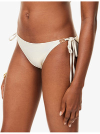 PRODUCT DETAILS - Melissa Odabash bikini bottoms - 86% polyamide, 14% elastane - Self-tie fastenings at sides - Low-rise, elasticated waistband, gold-toned double ring trims, shimmer finish, moderate coverage - Hand wash - True to size - Model is 5ft 10in/1.78m and wears a size UK 8 - Lightweight, slight stretch - For hygiene reasons, we are unable to exchange or refund this product if the protective adhesive strip has been removed. Ref: R04557289