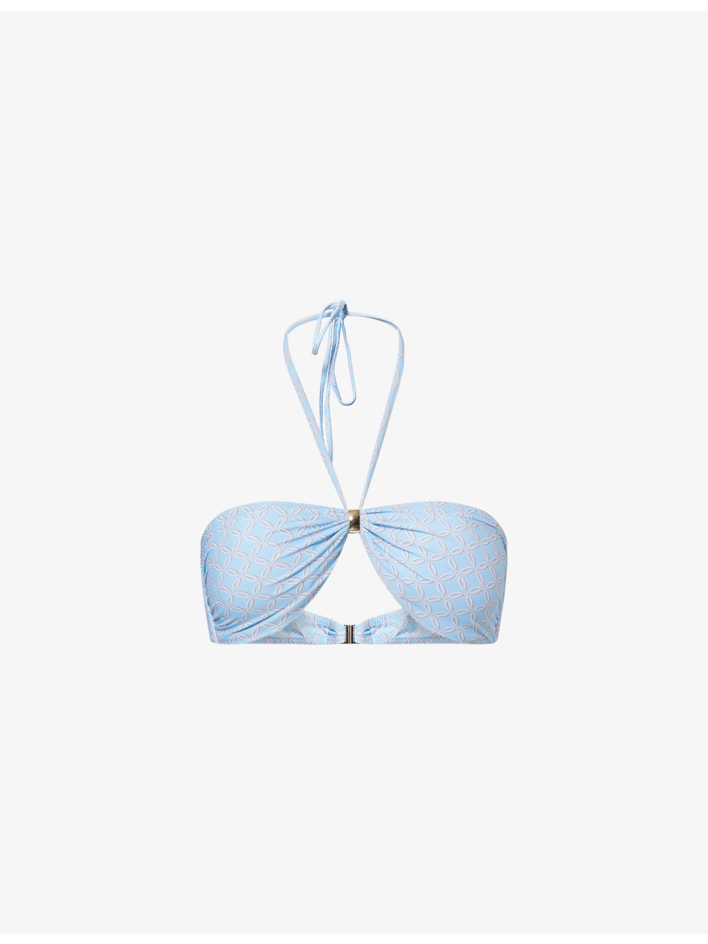 PRODUCT DETAILS - Melissa Odabash bikini top - 86% polyamide, 14% elastane - Clasp fastening - Bandeau style, gathered at cups with ring hardware, removable pads at cups, self-tie at front, polished hardware, geometric pattern - Machine wash cold - True to size - Model is 5ft 10in/1.78m and wears a size UK 8 - Lightweight, stretchy Ref: R04453252