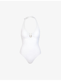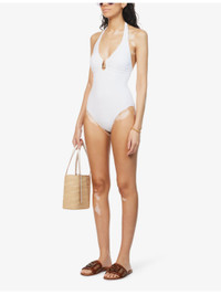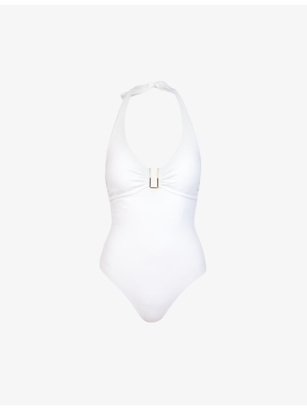 PRODUCT DETAILS - Melissa Odabash swimsuit - 86% polyamide, 14% elastane - Slips on - Halter-neck, self-tie fastening at neck, plunging neckline, gold-toned hardware, detachable cups, gathered at chest, open at back, medium coverage at back, fully lined - Hand wash cold - Made in Italy - True to size - Model is 5ft 9in/1.75m and wears a size UK 8 - Lightweight, stretchy