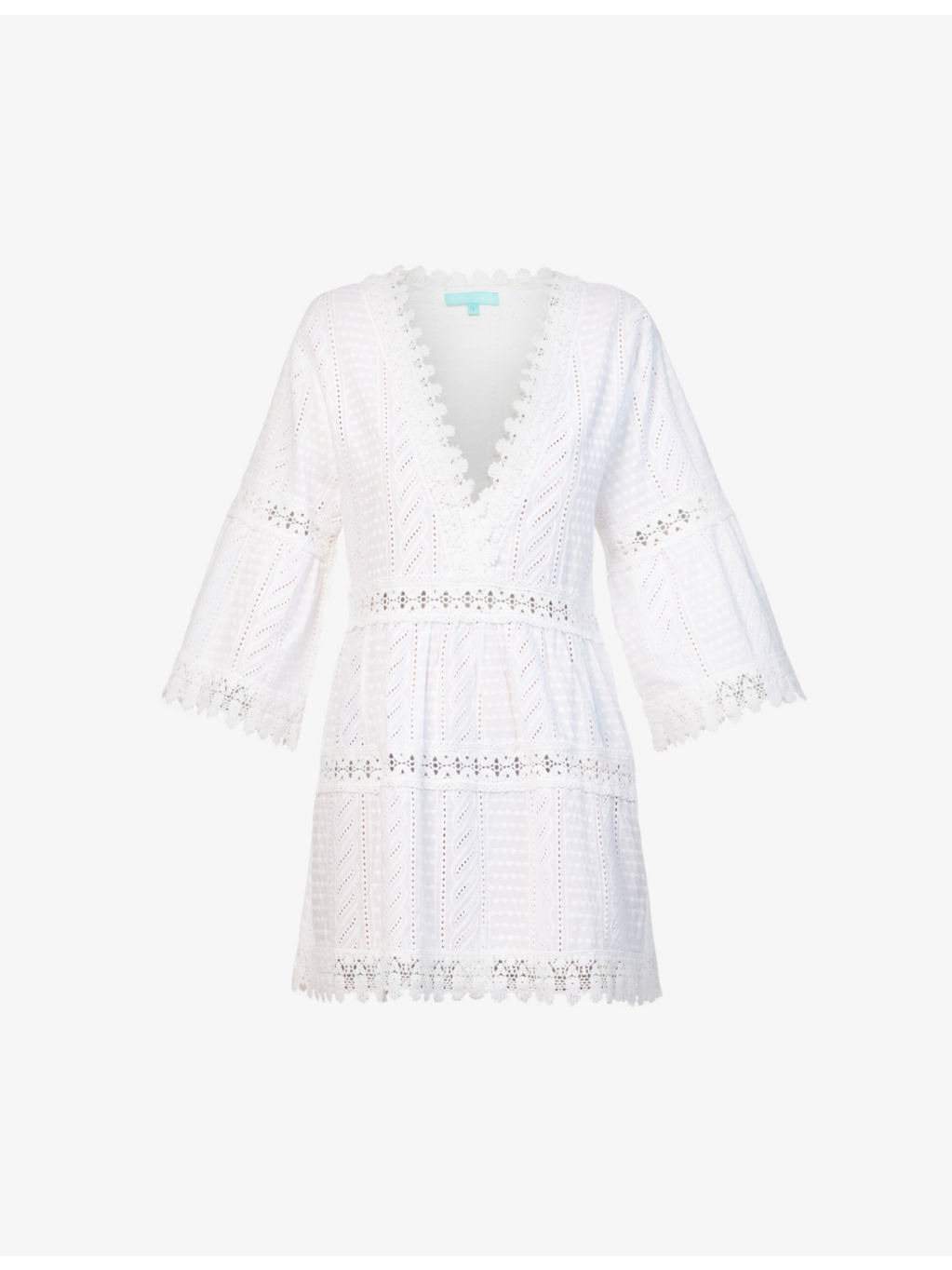 PRODUCT DETAILS - Melissa Odabash cotton cover-up - 100% cotton - Slips on - Relaxed fit, V-neck, three-quarter-length bell sleeves, semi-sheer, all-over cut-out pattern and embroidery, frilled lace trims - Hand wash cold - True to size - Model is 5ft 9in/1.75m and wears a size small - Lightweight, non-stretch