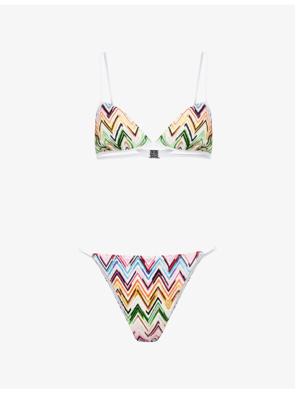 PRODUCT DETAILS - Missoni bikini set - 75% rayon, 15% polyamide, 10% elastane - Self-tie fastening - Top: Triangle shape, self-tie straps, chevron zig-zag print - Bottom: Mid-rise, self-tie straps, chevron zig-zag print, moderate rear coverage - Hand wash - Model is 5ft 10in/1.78m and wears a size small - Lightweight, stretchy - For hygiene reasons, we are unable to exchange or refund this product if the protective adhesive strip has been removed. Ref: R04602204