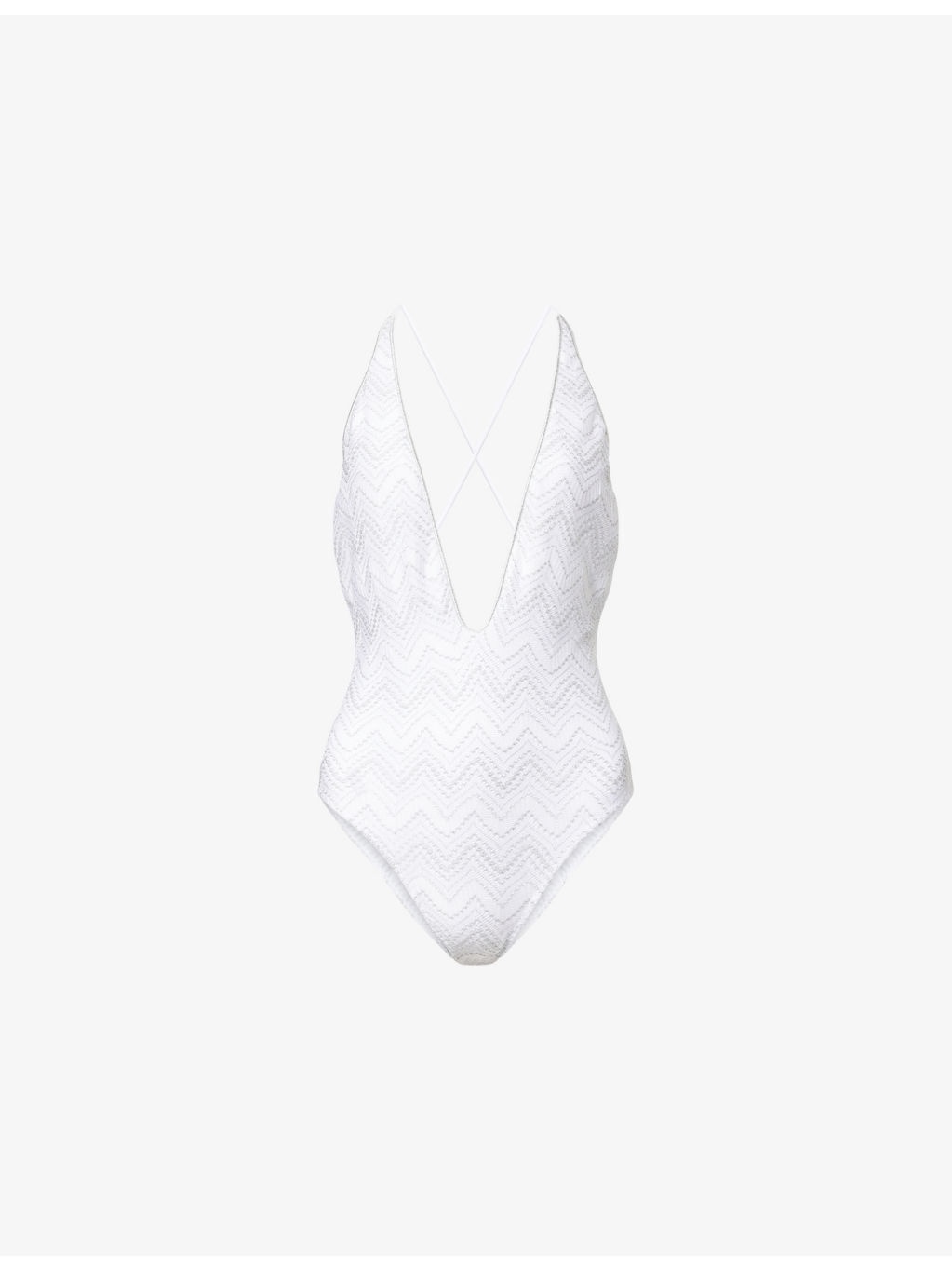 PRODUCT DETAILS - Missoni swimsuit - 91% viscose, 9% fiber - Self-tie fastening - Slim fit, narrow cross over straps, open back, high cut leg, medium coverage - Hand wash cold - Made in Italy - True to size - Model is 5ft 10in/1.78m and wears a size UK 8 - Lightweight, stretchy - For hygiene reasons, we are unable to exchange or refund this product if the protective adhesive strip has been removed. Ref: R04403679