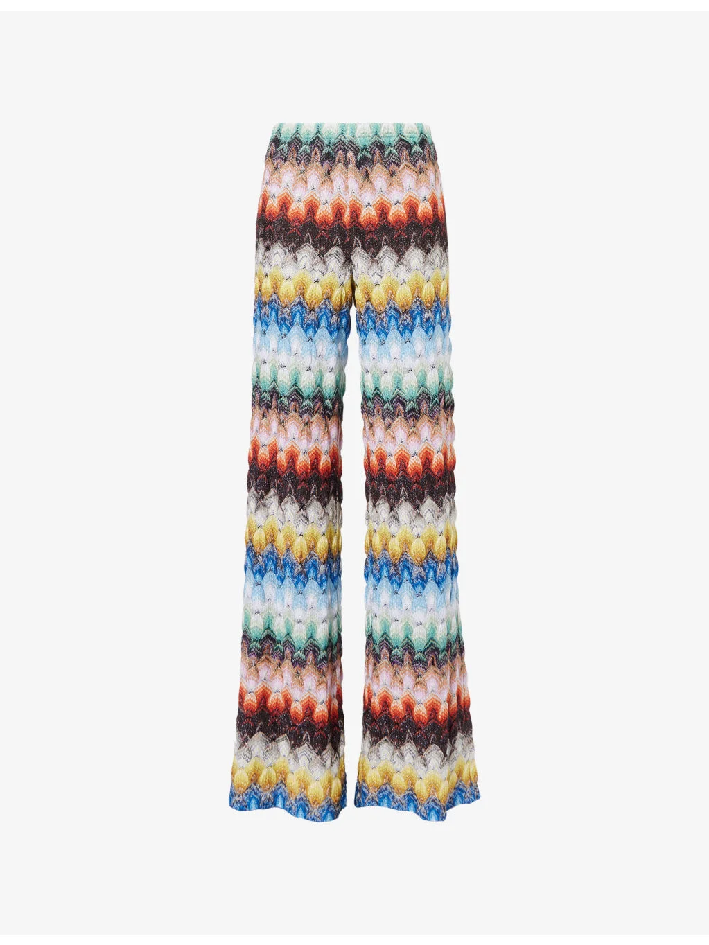 PRODUCT DETAILS - Missoni knitted trousers - 85% viscose, 15% metallic fibres; lining 77% polyamide, 23% elastane - Regular fit, mid-rise, straight leg, elasticated waistband, metallic knit, lined - Hand wash - True to size - Model is 5ft 10in/1.78m and wears a size UK 8 - Lightweight, stretchy Ref: R04581684