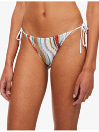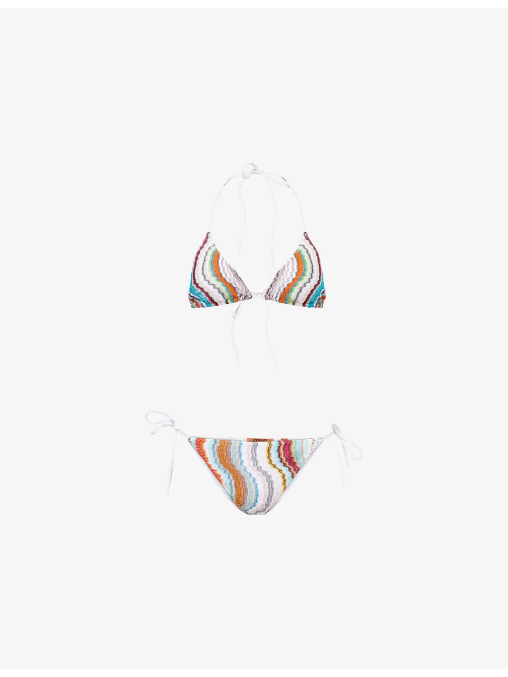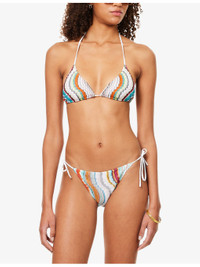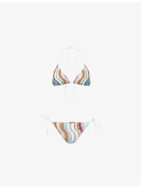 PRODUCT DETAILS - Missoni bikini set - 95% rayon, 5% metallic fibres - Top: Triangle shape, self-tie straps, chevron knit pattern, metallic thread weave - Bottom: Mid-rise, elasticated waistband, self-tie straps at waist sides, chevron knit, metallic thread weave, moderate rear coverage - Hand wash - True to size - Model is 5ft 10in/1.78m and wears a size UK 8 - Lightweight, stretchy - For hygiene reasons, we are unable to exchange or refund this product if the protective adhesive strip has been removed. Ref: R04403689