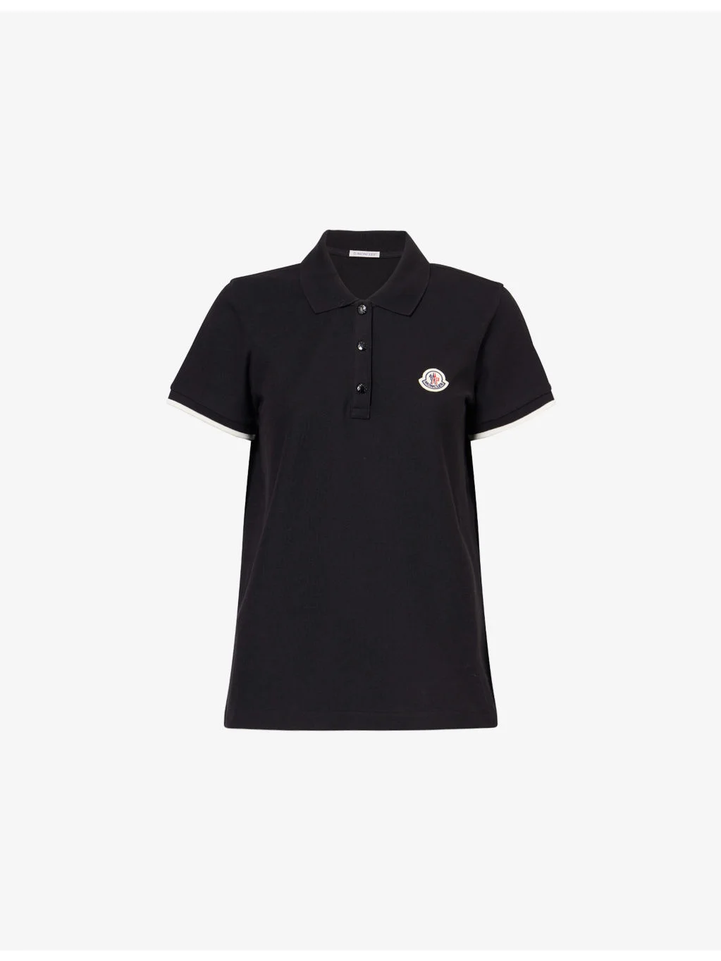 PRODUCT DETAILS - Moncler cotton polo shirt - 100% cotton - Exposed pressed stud fastenings at front - Regular fit, polo collar, three press-stud button placket, branded hardware, short sleeves, contrast ribbed cuffs, brand badge embroidered at chest, side slits - Machine wash at 30°C - Made in Italy - True to size - Model is 5ft 10in/1.78m and wears a size small - Lightweight, slight stretch Ref: R04569349