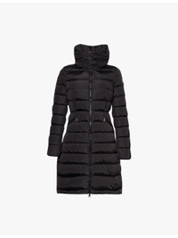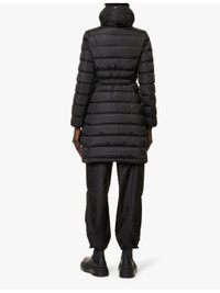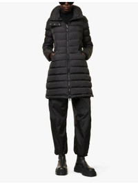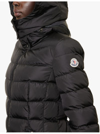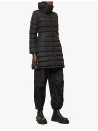 PRODUCT DETAILS - Moncler shell-down jacket - 100% polyamide; filling 90% goose down, 10% feathers; lining 100% polyamide - Exposed zip fastening at front - Slim fit, high neck, concealed hood, long sleeves, brand patch at sleeve, elasticated cuffs, two zip pockets at front, all-over quilted and padded, fully lined, flared hem - Hand wash cold - True to size - Size small: length 33in / 84cm - Model is 5ft 10in/1.78m and wears a size small - Lightweight, slight stretch Ref: R04314684