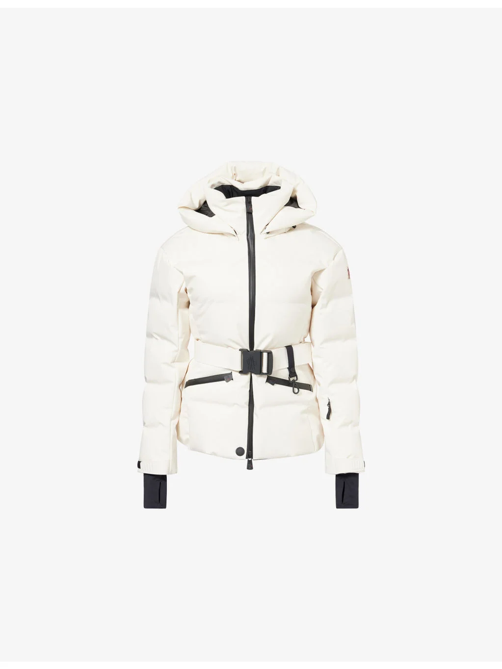 PRODUCT DETAILS - Moncler Grenoble stretch-woven down jacket - 87% polyester, 13% elastane; contrast 87% polyamide, 13% elastane; filling 90% down, 10% feathers; lining 89% polyester, 11% elastane - Concealed zip fastening at front - Slim fit, high-neck, detachable drawstring hood, long sleeves, brand patch at sleeve, hook-and-loop tape cuffs, internal elasticated cuffs, two zip pockets at front, cinched elasticated waist, belt loops, detachable belt, all-over quilted and padded, fully lined, internal elasticated hem, water-repellent, breathable - Machine wash at 30°C - Made in Romania - True to size - Size small: length 23in / 59cm - Model is 5ft 10in/1.78m and wears a size small - Midweight, non-stretch Ref: R04553020