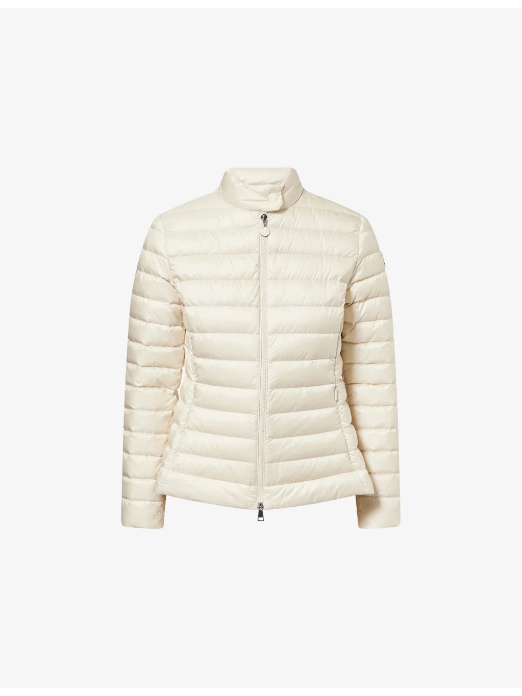PRODUCT DETAILS - Moncler shell-down jacket - 100% polyamide; filling 90% down, 10% feathers; lining 100% polyamide - Exposed zip fastening at front - Slim fit, band-collar, long sleeves, brand patch at sleeve, two zip pockets at front, cinched waist, all-over quilted and padded, fully lined, flared hem - Hand wash cold - True to size - Size small: length 23in / 59cm - Model is 5ft 10in/1.78m and wears a size small - Lightweight, non-stretch Ref: R04569331