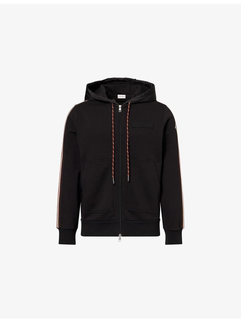 PRODUCT DETAILS - Moncler cotton hoodie - 100% cotton - Zip fastening at front - Regular fit, drawstring hood, long sleeves, striped panel and logo patch at sleeve, logo patch at chest, kangaroo pockets at front - Machine wash at 30°C - Model is 6ft 2in/1.88m and wears a size medium - Midweight, slight stretch Ref: R04595348