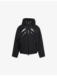 PRODUCT DETAILS - Moncler Genius x Asap Rocky shell jacket - 87% polyamide, 13% elastane; filling 90% goose down, 10% goose feather - Exposed zip fastening at front - Fixed hood, long sleeves, branded logo badge at sleeve, two slip pockets at front, embossed panel design at front and back, padded, fully lined, drawstring hem, graphic print logo at back - Machine wash at 30°C - Made in Romania - Size UK 40: length 31.4in / 80cm, chest 55.1in / 140cm - Model is 6ft 2in/1.88m and wears a size UK 40 - Midweight, non-stretch Ref: R04529420