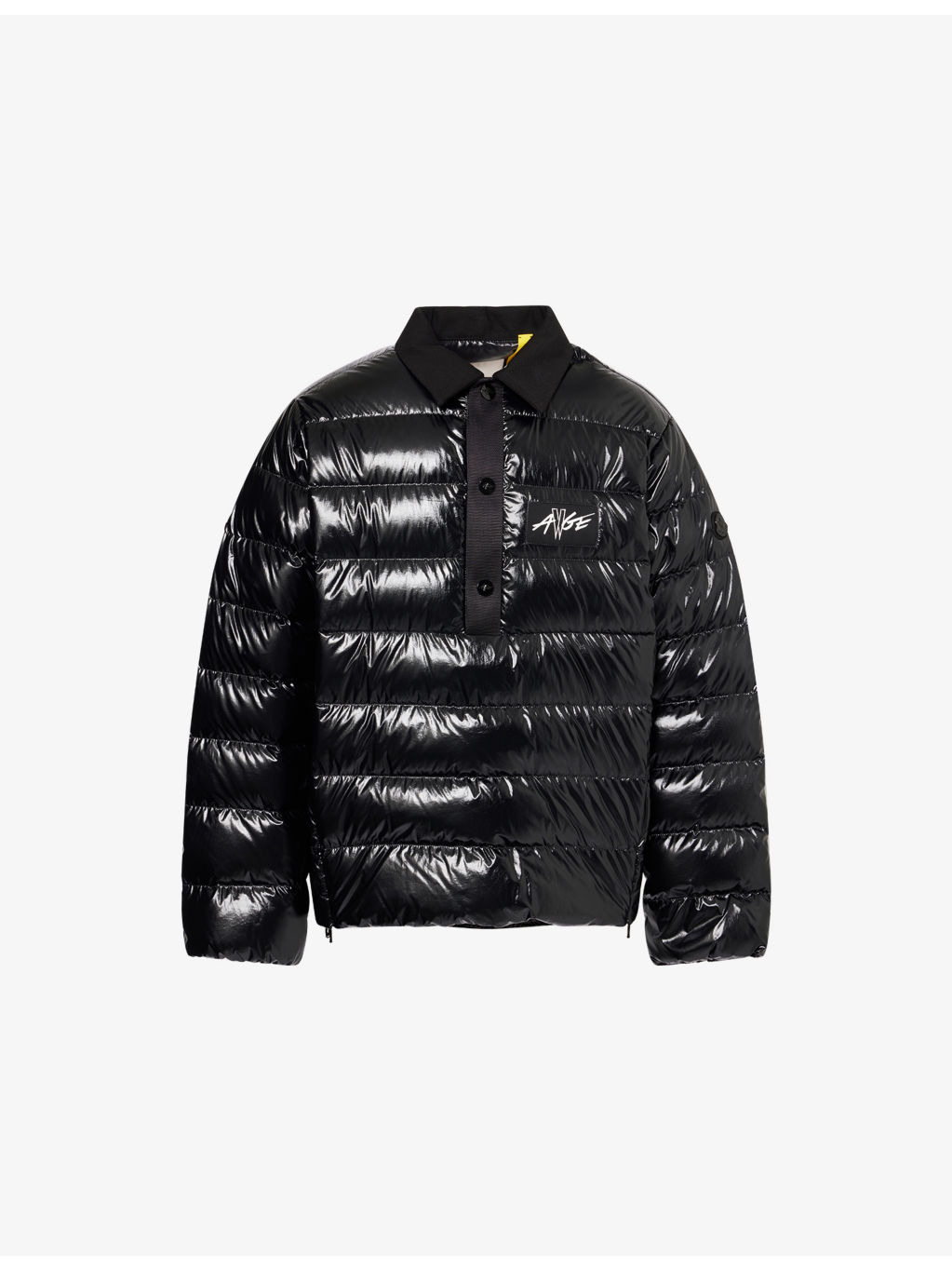 PRODUCT DETAILS - Moncler Genius x Asap Rocky shell shirt - 100% polyester; filling 90% goose down, 10% goose feather - Popper fastening - Ribbed collar, long sleeves, elasticated cuffs, branded logo badge at sleeve, press-stud with placket at front, embroidered graphic print patch at chest, zipped side hem slits, one internal slip pocket at front, drawstring hem, all-over padding, shiny finish - Machine wash at 30°C - Made in Romania - Size 3: length 29.5in / 75cm, chest 47.2in / 120cm - Model is 6ft 2in/1.88m and wears a size 3 - Lightweight, non-stretch Ref: R04529430
