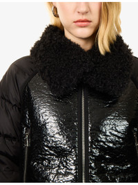 PRODUCT DETAILS - Moncler shell-down jacket - 100% polyamide; contrast 100% polyester; filling 90% down, 10% feathers - Exposed zip fastening at front - Relaxed fit, teddy collar, long sleeves, patent-effect front, two zipped pockets, teddy trim to cuffs and hem, quilted, logo patch - Specialist dry clean only - True to size - Model is 5ft 11in/1.80m and wears a size UK 8 - Midweight, non-stretch Ref: R04487485