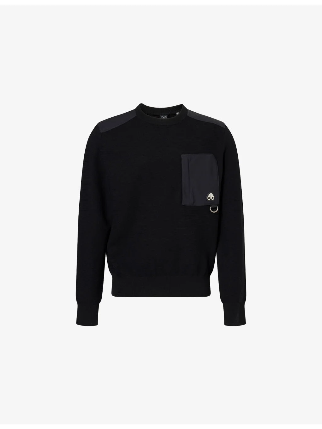 PRODUCT DETAILS - Moose Knuckles knitted sweatshirt - 50% viscose, 25% nylon, 20% polyester, 5% elastane; contrast 58% nylon, 24% polyester, 18% elastane - Regular fit, crewneck, contrast panel at shoulders, long sleeves, contrast zip pocket and brand plaque at front, all-over knitted and ribbed - Machine wash at 30°C - Model is 6ft 2in/1.88m and wears a size medium - Midweight, stretchy Ref: R04560519