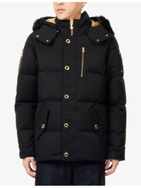 PRODUCT DETAILS - Moose Knuckles cotton-blend down jacket - 74% cotton, 26% nylon; filling 90% duck down, 10% feathers; lining 100% polyester - Exposed button fastening and exposed zip fastening at front - Regular fit, high-neck, detachable hood, detachable faux-fur trim, long sleeves, brand plaque and zip pockets at sleeves, internal knitted cuffs, zipped cuffs, two buttoned pockets at front, zip fastening at sides, all-over quilted and padded, fully lined - Machine wash at 30°C - Size medium: length 29in / 75cm, chest 46in / 117cm - Model is 6ft 2in/1.88m and wears a size medium - Heavyweight, non-stretch Ref: R04560521