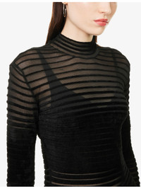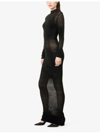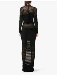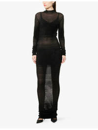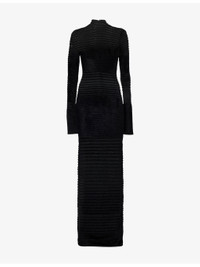 PRODUCT DETAILS - Mugler woven gown - 74% viscose, 26% polyamide - Concealed zip fastening at back - Slim fit, high-neck, long sleeves, all-over ribbed, all-over sheer and velvet texture, knitted - Hand wash cold - Made in Portugal - True to size - Size UK 8: length 65in / 165cm - Model is 5ft 10in/1.78m and wears a size UK 8 - Lightweight, stretchy Ref: R04535290
