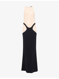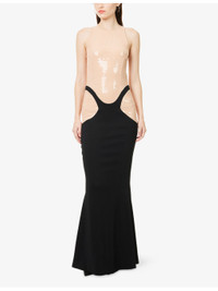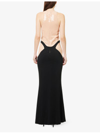 PRODUCT DETAILS - Mugler stretch-woven gown - 96% viscose, 4% elastane; contrast 65% acetate, 35% silk; lining 100% cupro - Concealed zip fastening at back - Slim fit, round-neck, sleeveless, darts at front and back, sequin embellished top, contrast satin panels and skirt - Dry clean - Made in Portugal - True to size - Size UK 8: length 62in / 157cm - Model is 5ft 10in/1.78m and wears a size UK 8 - Lightweight, stretchy Ref: R04535283