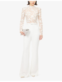 PRODUCT DETAILS - Nadine Merabi woven jumpsuit - 100% polyamide - Concealed zip fastening - Regular fit, round neck, long sleeves, padded shoulders, sheer lace top, detachable belt at waist, wide leg trouser, fully lined - Dry clean - Size small: length 64in / 162.5cm - Model is 5ft 10in/1.78m and wears a size small - Midweight, non-stretch Ref: R04585687
