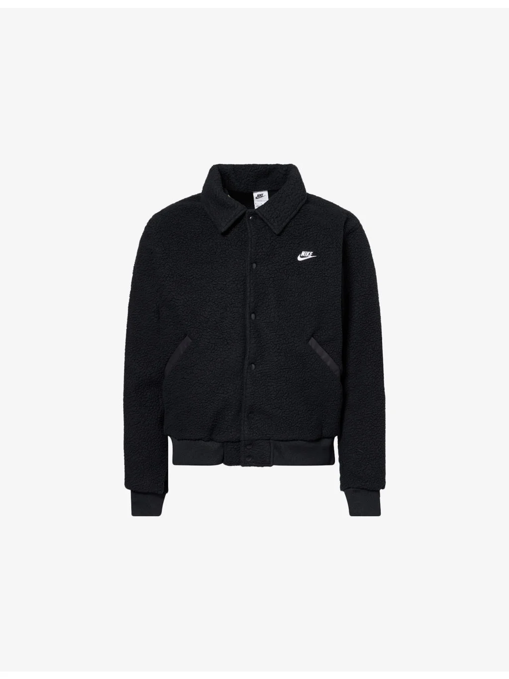 PRODUCT DETAILS - Nike sherpa jacket - 100% polyester; trims 97% polyester, 3% elastane - Popper fastening at front - Regular fit, spread collar, long sleeves, brand embroidery and two welt pockets at front, all-over sherpa texture, ribbed trims - Machine wash at 30°C - Size medium: length 24in / 62cm, chest 48in / 122cm - Model is 6ft 2in/1.88m and wears a size medium - Midweight, stretchy Ref: R04563130