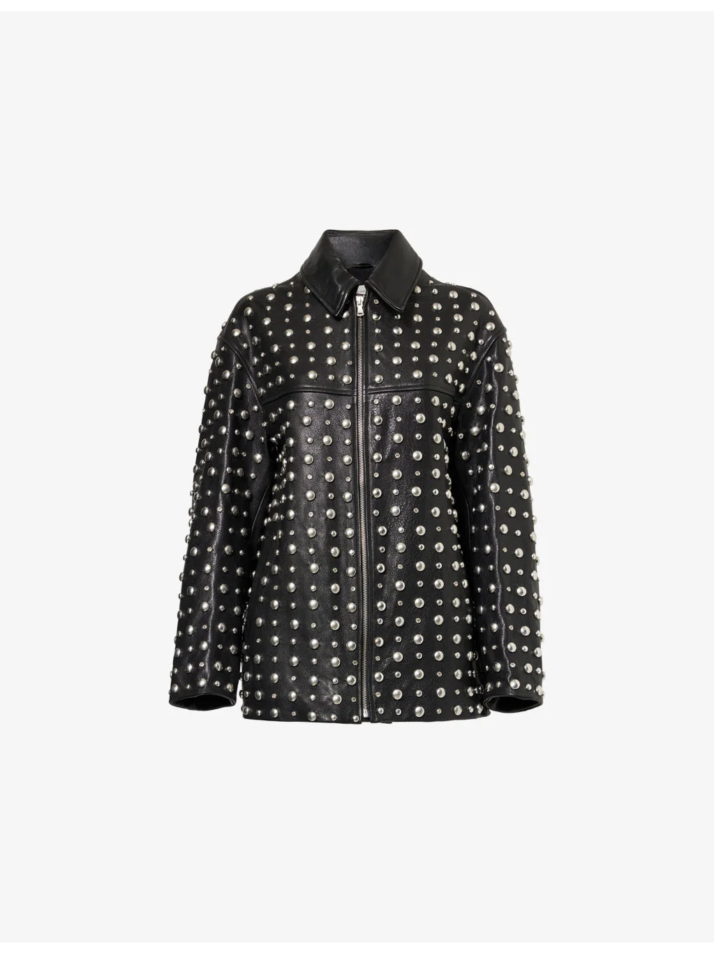 PRODUCT DETAILS - Nour Hammour leather jacket - 100% lamb leather; lining 63% cupro, 37% viscose - Exposed zip fastening at front - Relaxed fit, spread-collar, long sleeves, two welt pockets at front, all-over stud embellishment, all-over grained leather, fully lined - Specialist leather clean - Made in Turkey - True to size - Size small: length 26in / 67cm - Model is 5ft 10in/1.78m and wears a size small - Heavyweight, non-stretch Ref: R04564400