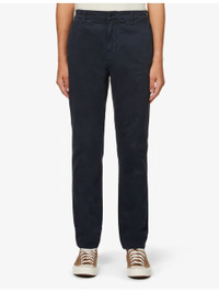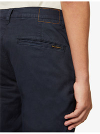 PRODUCT DETAILS - Nudie Jeans organic stretch-cotton trousers - 97% organic cotton, 3% elastane - Exposed button and concealed zip-fly fastenings at front - Regular fit, mid-rise, tapered leg, belt loops, slip pockets at sides, darts at back, welt pockets at back, branded tab at back pocket - Machine wash cold - Size UK 32: Rise 10in / 26cm, inside leg 33in / 84cm, leg opening 14in / 36cm - Model is 6ft 2in/1.88m and wears a size UK 32 - Lightweight, slight stretch Ref: R03802055