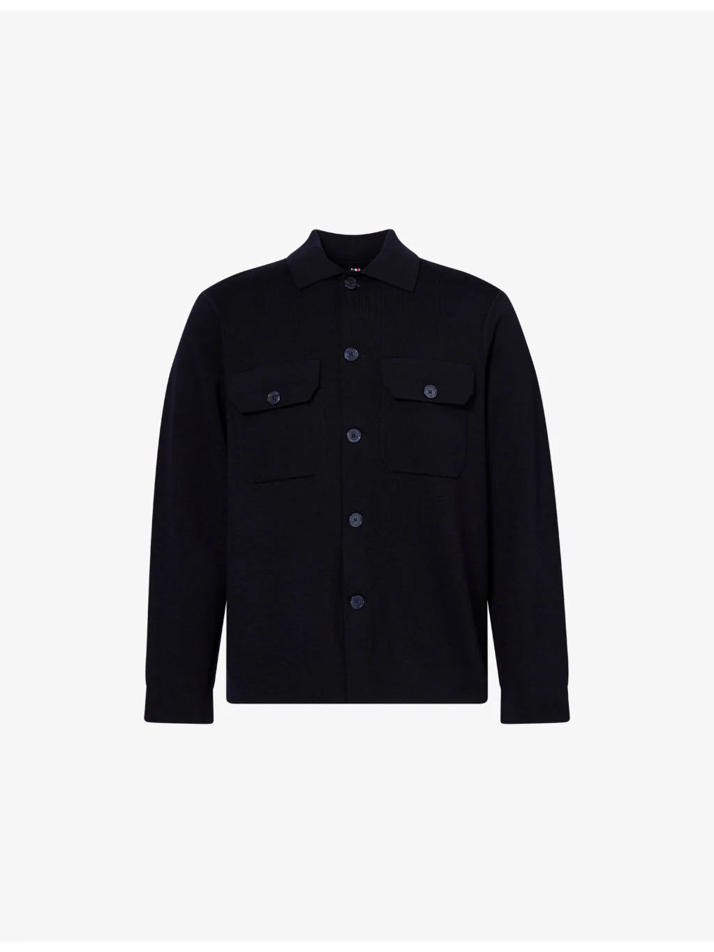 PRODUCT DETAILS - Orlebar Brown wool jacket - 100% merino wool - Exposed button fastening at front - Relaxed fit, spread collar, long sleeves, two buttoned pockets at front, all-over knitted - Hand wash cold - Made in Turkey - Size medium: length 27in / 69cm, chest 44in / 112cm - Model is 6ft 2in/1.88m and wears a size medium - Midweight, stretchy Ref: R04548876
