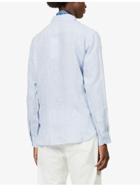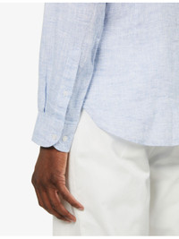 PRODUCT DETAILS - Orlebar Brown linen shirt - 100% linen - Exposed button fastenings at front - Spread collar - Double-button barrel cuffs - Relaxed fit, long sleeves, all-over contrasting thread, branded tab at side seam, curved hem - Machine wash cold - Made in Portugal - Size medium: Length 30in / 76cm, chest 38in / 97cm - Model is 6ft 2in/1.88m and wears a size medium - Lightweight, non-stretch Ref: R03824004