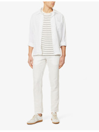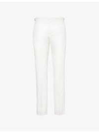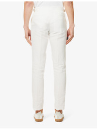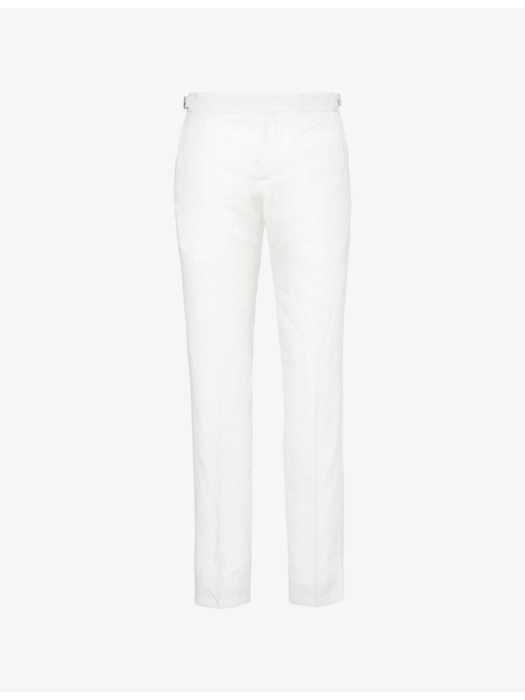 PRODUCT DETAILS - Orlebar Brown linen trousers - 100% linen; lining 100% cotton - Concealed button, hook-and-eye and zip-fly fastening at front - Slim fit, mid rise, straight leg, buckle epaulette at sides waistband, two slip pockets at front, two welt pockets at back, pressed centre creases - Specialist dry clean - Size UK 30: rise 10in / 26cm, inside leg 32in / 82cm, leg opening 14in / 36cm - Model is 6ft 1in/1.85m and wears a size UK 30 - Midweight, non-stretch Ref: R04394143