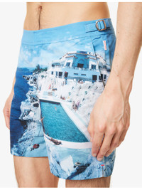 PRODUCT DETAILS - Orlebar Brown swim shorts - 100% polyester; lining 100% polyester - Concealed press-stud and zip-fly fastening at front - Regular fit, mid rise, structured waistband, waist adjusters at waistband, two side slip pockets, one rear zip pocket, brand text tab at front, darts at back, internal mesh brief, silver-toned branded hardware, all-over photograph print - Machine wash at 30°C - Made in Portugal - Model is 6ft 2in/1.88m and wears a size UK 30 - Lightweight, non-stretch Ref: R04453477