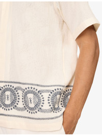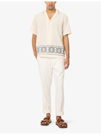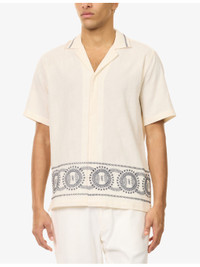PRODUCT DETAILS - Orlebar Brown cotton-knit shirt - 100% cotton - Concealed button fastenings at front - Camp collar - Closed cuffs - Relaxed fit, V-neck, embroidered collar, short sleeves, straight yoke at back, split at sides, embroidered hem - Hand wash cold - Made in Portugal - Size medium: length 28in / 71cm, chest 20in / 107cm - Model is 6ft 2in/1.88m and wears a size medium - Lightweight, stretchy Ref: R04548884