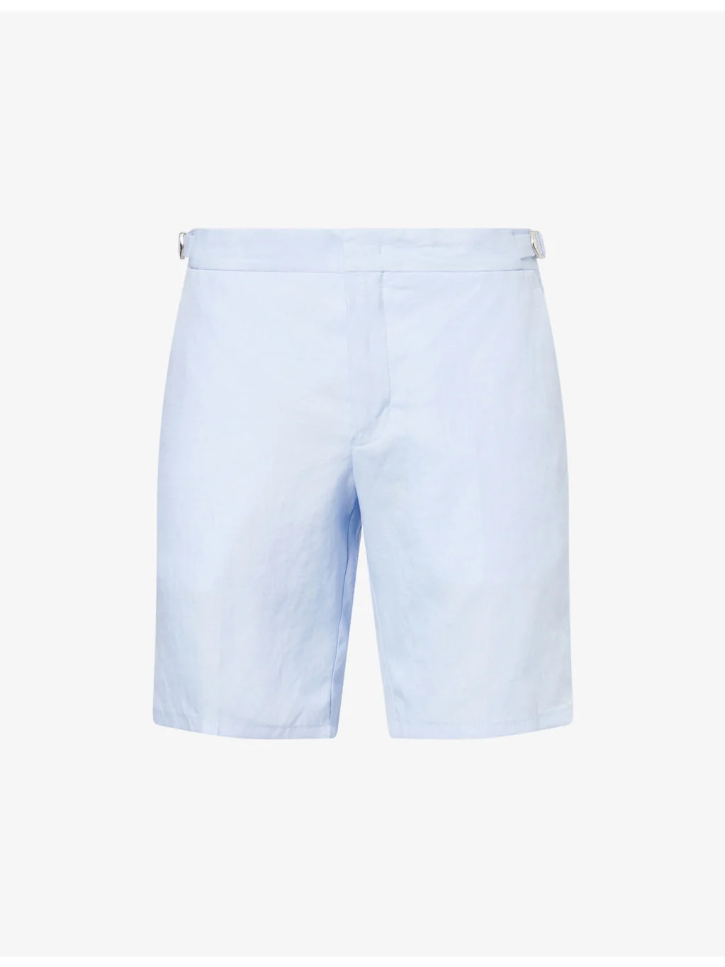 PRODUCT DETAILS - Orlebar Brown linen shorts - 100% linen; pocketlining 100% cotton - Concealed button, hook-and-eye and zip-fly fastening at front - Regular fit, mid-rise, buckles at waistband, two slip pockets at front, two welt pockets and darts at back - Dry clean - Made in Portugal - Size UK 30: rise 12in / 32cm, inside leg 9in / 23cm, leg opening 20in / 51cm - Model is 6ft 2in/1.88m and wears a size UK 30 - Lightweight, slight stretch Ref: R04548901