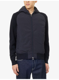 PRODUCT DETAILS - Orlebar Brown wool-down hoodie - 100% merino wool; contrast 87% polyamide, 13% elastane; filling 80% goose down, 20% feathers; lining 100% polyamide - Exposed zip fastening at front - Regular fit, high-neck, drawstring hood, raglan long sleeves, two zip pockets at front, contrast texture and padded at front, all-over knitted, partially lined, ribbed trims - Hand wash cold - Made in Turkey - Model is 6ft 2in/1.88m and wears a size medium - Midweight, stretchy Ref: R04548879