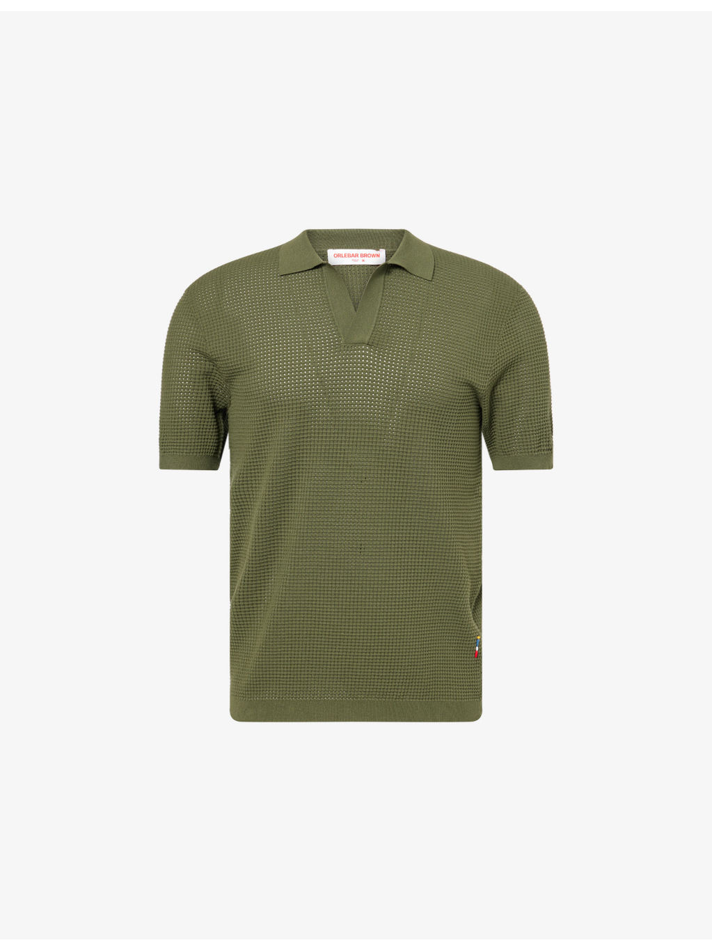 PRODUCT DETAILS - Orlebar Brown knitted polo shirt - 70% viscose, 30% polyester - Pointed collar, V-neck opening, short sleeves, all-over open knit texture, ribbed trims - Machine wash at 30°C - Made in Italy - Model is 6ft 2in/1.88m and wears a size medium - Lightweight, stretchy Ref: R04498457