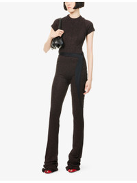 PRODUCT DETAILS - Ottolinger stretch-cotton blend trousers - 78% cotton, 10% metallic fibres, 9% polyamide, 3% elastane - Slim fit, low-rise, skinny leg, elasticated waistband, double waistband, ruffled panel and brand embroidery at front, all-over metallic weave, all-over knitted, flared cuffs - Machine wash at 30°C - Made in Greece - True to size - Size small: rise 10in / 26cm, inside leg 47in / 120cm, leg opening 16in / 41cm - Model is 5ft 10in/1.78m and wears a size small - Midweight, stretchy Ref: R04520707