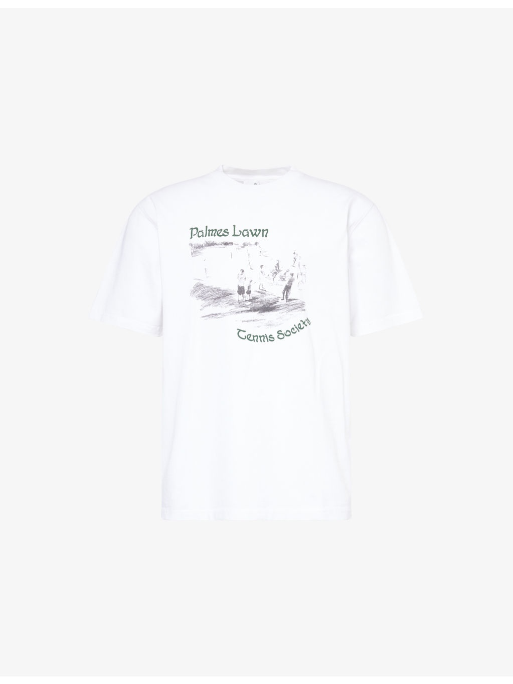 PRODUCT DETAILS - Palmes cotton t-shirt - 100% cotton - Relaxed fit, ribbed crewneck, short sleeves, text and graphic print at front - Machine wash at 30°C - Made in Portugal - Model is 6ft 2in/1.88m and wears a size medium - Lightweight, non-stretch Ref: R04489266