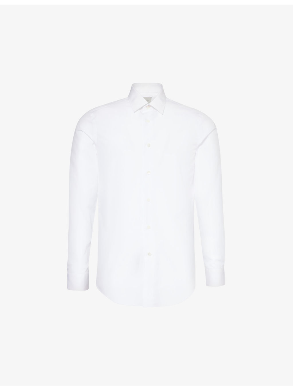 PRODUCT DETAILS - Paul Smith cotton shirt - 100% cotton - Exposed button fastenings at front - Straight-point collar - Buttoned cuffs - Slim fit, long sleeves, darts at back, curved hem - Machine wash cold - Made in Italy - Collar size 15: length 31in / 79cm, chest 40in / 102cm - Model is 6ft 2in / 1.88m and wears a collar size 15 - Midweight, non-stretch Ref: R04315564