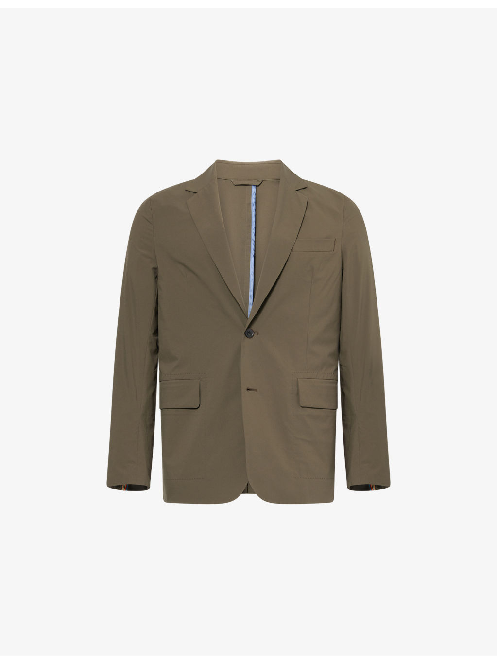 PRODUCT DETAILS - Paul Smith woven blazer - 100% polyester; lining 100% polyester - Exposed button fastening at front - Regular fit, single-breasted, notch lapels, long sleeves, buttoned cuffs, welt pocket and two flap pockets at front, partially lined, double vent, water repellent, UV protection - Dry clean only - Size UK 38: length 28in / 73cm, chest 40in / 102cm - Model is 6ft 2in/1.88m and wears a size UK 38 - Lightweight, stretchy Ref: R04465833