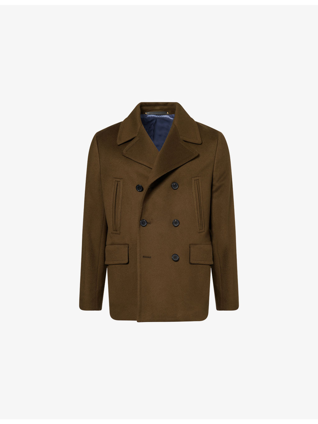 PRODUCT DETAILS - Paul Smith wool-cashmere blend pea coat - 90% wool, 10% cashmere - Button fastening at front - Notched lapel, long sleeves, two slanted welt pockets at chest, two flap pockets at front, straight hem, fully lined - Dry clean - Made in Italy - Size medium: length 31.4in / 80cm, chest 42.5in / 108cm - Model is 6ft 2in/1.88m and wears a size medium - Midweight, non-stretch Ref: R04484552