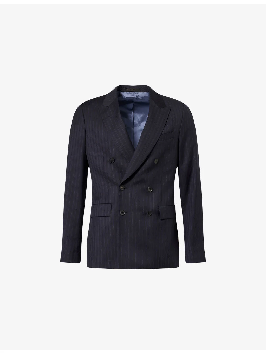 PRODUCT DETAILS - Paul Smith woven blazer - 100% viscose - Button fastening at front - Regular fit, peak lapels, padded shoulders, long sleeves, buttoned cuffs, welt pocket at chest, flap pockets at front, all-over pinstripe pattern, double vent at back - Dry clean - Size UK 38: length 29in / 74cm, chest 40in / 102cm - Model is 6ft 2in/1.88m and wears a size UK 38 - Midweight, non-stretch Ref: R04536667