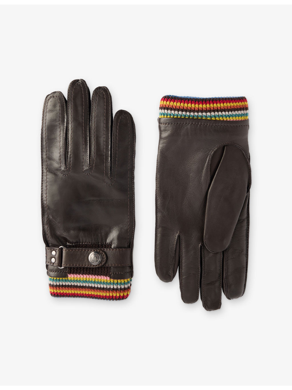 PRODUCT DETAILS - Paul Smith leather gloves - 100% sheep leather; lining 100% wool - Ribbed striped cuffs, buttoned epaulette at top, all-over grained leather, silver-toned hardware, fully lined - Specialist leather clean - Made in Italy Ref: R04506747
