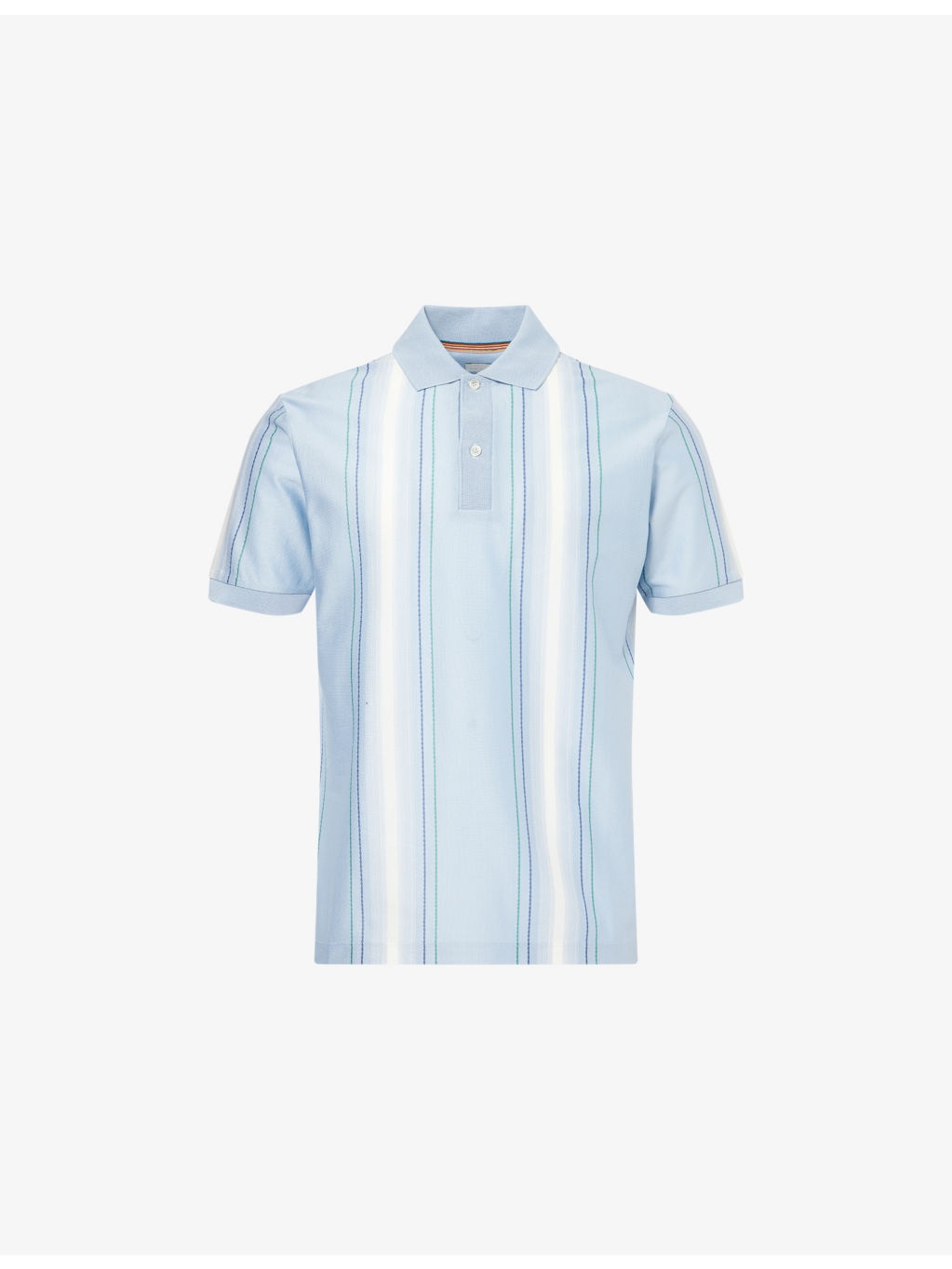 PRODUCT DETAILS - Paul Smith cotton-pique polo shirt - 100% cotton - Exposed button fastening at front - Polo collar - Regular fit, ribbed collar, short sleeves, two-button placket, all-over stripe print, dropped hem, slit at hem sides - Machine wash at 30°C - Made in Italy - Model is 6ft 2in/1.88m and wears a size medium - Lightweight, slight stretch Ref: R04457756