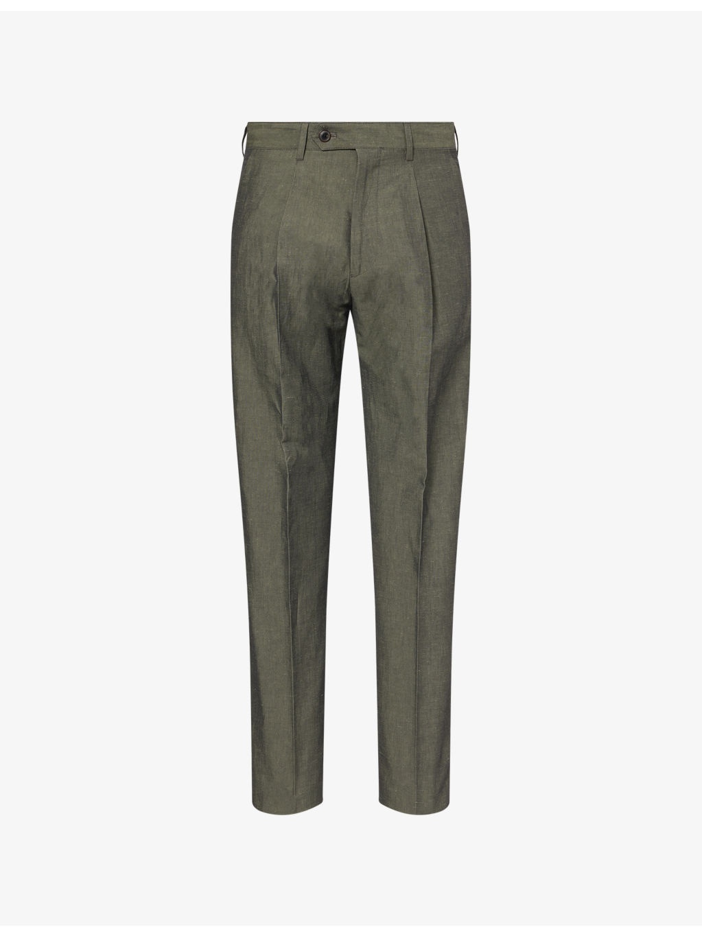 PRODUCT DETAILS - Paul Smith cotton and linen trousers - 50% linen, 50% cotton - Button, hook-and-eye and zip-fly fastening - Slim fit, mid-rise, tapered-leg, structured waistband with belt loops, pressed centre creases and pleats, two angled pockets at front, two pockets at back - Dry clean only - Made in Portugal - Size 30: rise 12.5in / 32cm, inside leg 30in / 76cm, leg opening 14.5in / 36cm - Model is 6ft 2in/1.88m and wears a size UK 30 - Lightweight, non-stretch Ref: R04457751