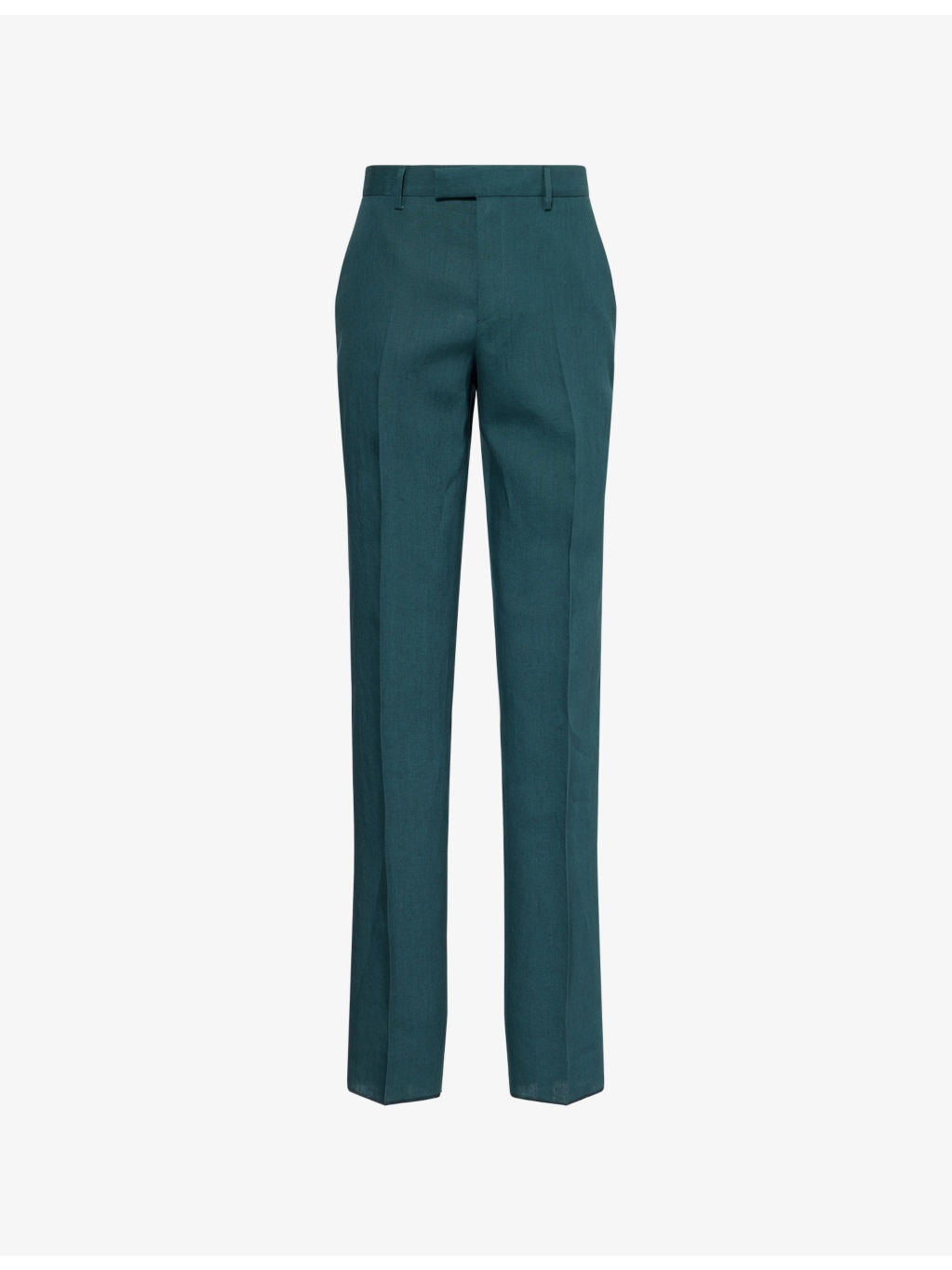 PRODUCT DETAILS - Paul Smith linen trousers - 100% linen - Button, hook-and-eye and zip-fly fastening - Slim fit, mid-rise, tapered-leg, structured waistband with belt loops, pressed centre creases and pleats, two angled pockets at front, two pockets at back, unfinished hem - Dry clean only - Made in Portugal - Size 30: rise 10.5in / 26cm, inside leg 35in / 89cm, leg opening 14.5in / 36cm - Model is 6ft 2in/1.88m and wears a size UK 30 - Midweight, non-stretch Ref: R04457761